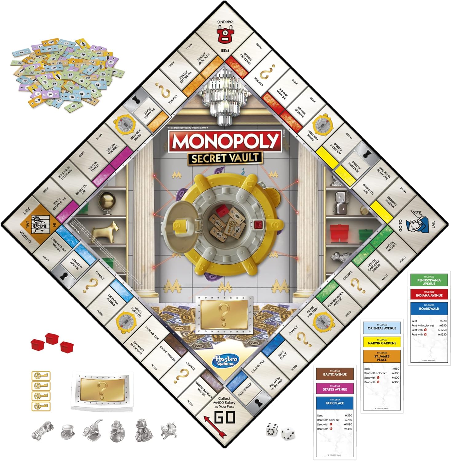 - MONOPOLY GAME WITH VAULT UNIT: In the Monopoly Secret Vault board game, Mr. Monopoly gives players chances to take riches from his vault -- if they can guess the code to unlock it