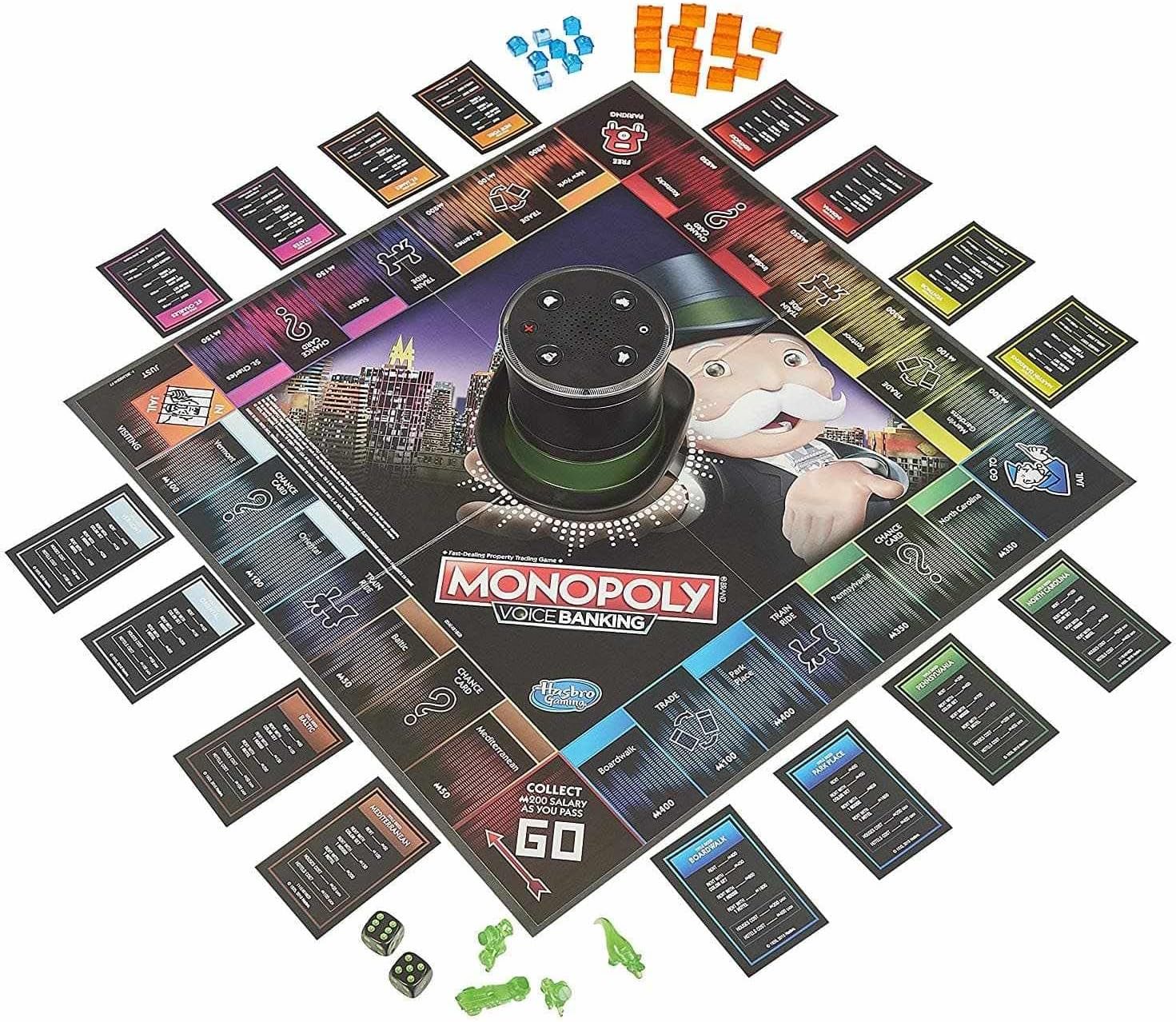 The Monopoly voice banking game features lights and sounds and comes with an interactive Mr Monopoly banking unit. The iconic Monopoly top hat is voice-activated and the personality of Mr Monopoly really shines as he handles All of the transactions. He keeps tabs on players' Money and properties so there's no cash or cards to think about.
