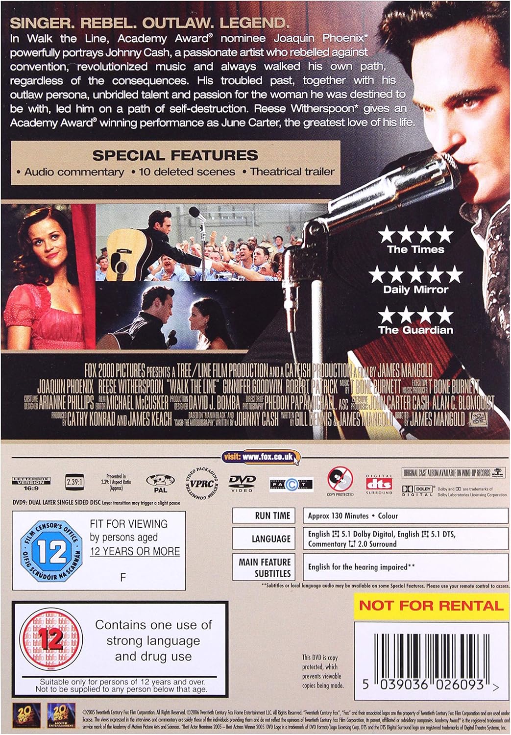 Drama following the life of the legendary 'Man in Black', Johnny Cash. The movie begins in 1955, when a tough, skinny guitar-slinger who called himself J.R. Cash (Joaquin Phoenix) walks into the soon-to-be-famous Sun Studios in Memphis. It was a moment that would have an indelible effect on American culture. With his driving freight-train chords, steel-eyed intensity and a voice as deep and black as night, Cash sang blistering songs of heartache and survival that were gutsy, full of real life and unlike anything heard before. That day kicked off the electrifying early career of Johnny Cash. As he pioneered a fiercely original sound that blazed a trail for rock, country, punk, folk and rap stars to come, Cash began a rough-and-tumble journey of personal transformation. In the most volatile period of his life, he evolved from a self-destructive pop star into the iconic 'Man in Black' - facing down his demons, fighting for the love that would save him time and again, and learning how to walk the razor-thin line between destruction and redemption. Reese Witherspoon won a Best Actress Academy Award for her role as June Carter, Cash's long-suffering wife.